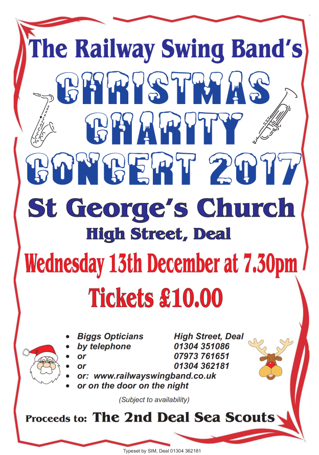 The Railway Swing Band are proud to be hosting their annual Christmas Concert at St George’s Church in Deal on Wednesday 13th December at 7.30pm. Tickets are £10 and include a drink and all proceeds are being donated to support The 2nd Deal Sea Scouts.